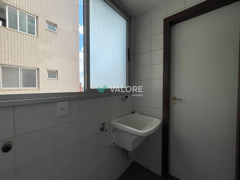 Área de serviço com tanque e armários.