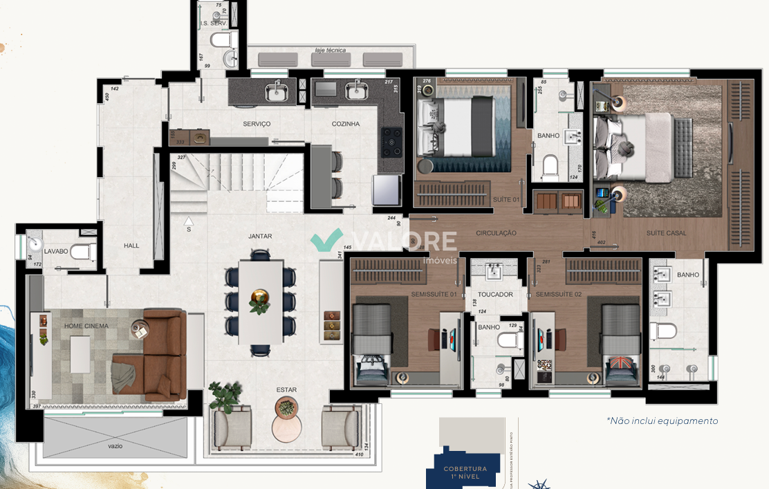 .1º Nível - Sala para 2 ambientes com piso em porcelanato;